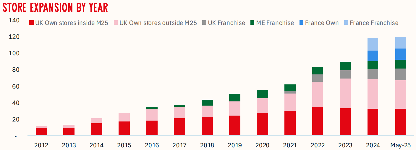 65 of the UK locations are company-operated, with the remaining 12 franchised by two multi-unit operators. There are another 10 franchised locations in the Middle East.