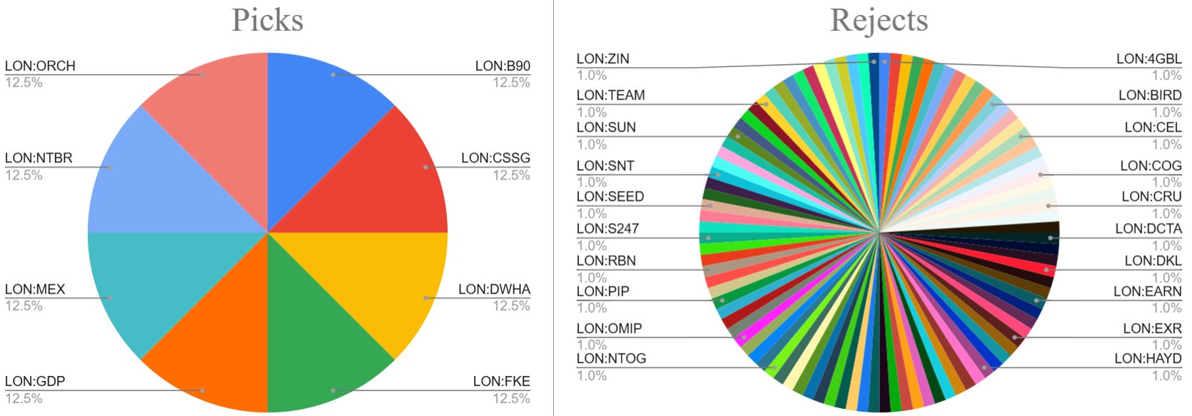 Note that only 8 selections have made it in – I’ve excluded Empresaria, because although I think there is big upside potential there, I’m not that keen on management and it’s way outside my circle of competence; and Enwell, because how it will perform is really a legal and geopolitical question, which I’m not well-suited to answer. The remaining 8 are equally weighted, for the avoidance of regret and to make the results tamper-proof.