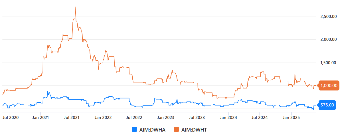 The £53m market cap was based on a weighted average of the two classes — but as you can see from the chart at the top, the two trade at very different prices. While the voting shares most recently traded at 905p (implying an effective market cap of £69m), the non-voting shares are currently only 542p (effective market cap £41m). What’s more, the illiquidity means prices are very volatile — just a couple weeks ago, a few hundred DWHA shares traded hands as low as 450p (£34m).