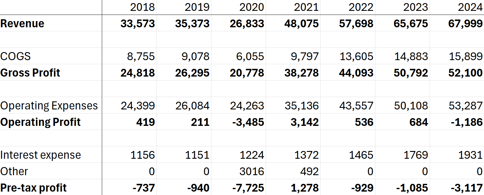 However, the stock chart at the top (which goes back to IPO) is obviously pretty brutal – and the financial performance doesn’t look too great either, at least on the bottom line: