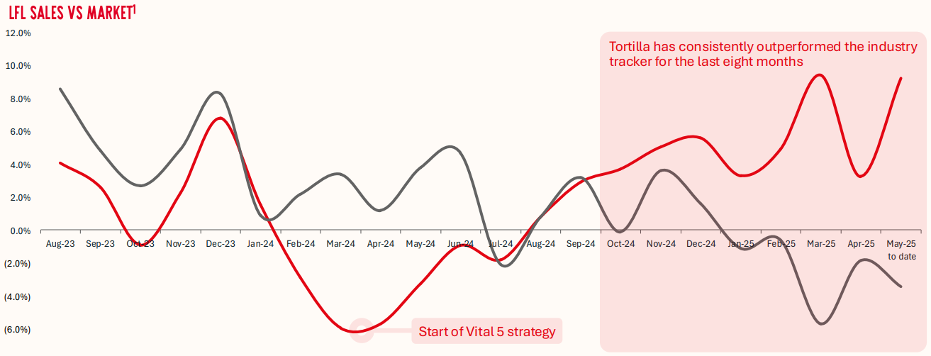 Okay, all of that sounds great, but what about the financial impact? I think this chart is useful – it shows the YoY change in like-for-like sales leading up to and following the change in leadership, for both Tortilla and the overall market.