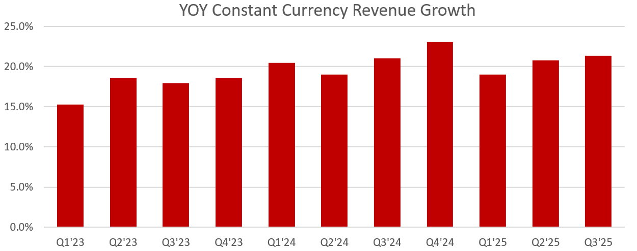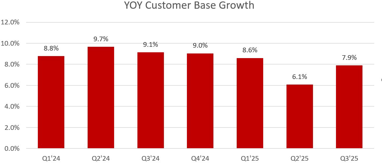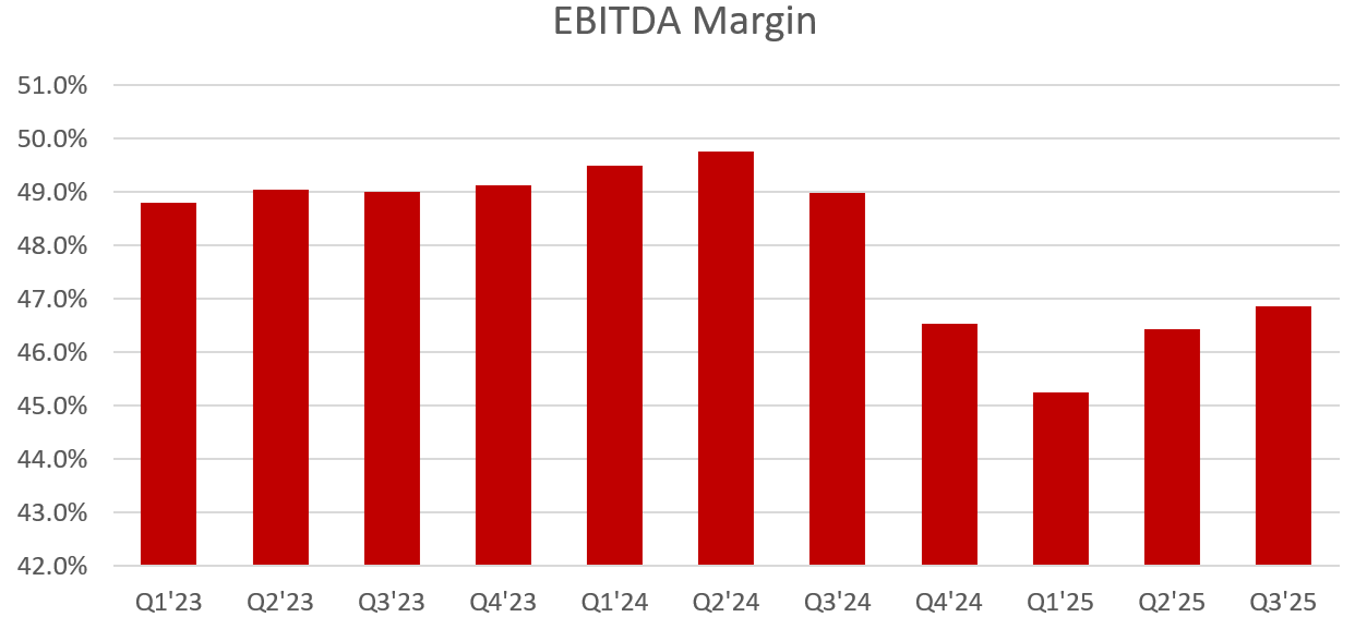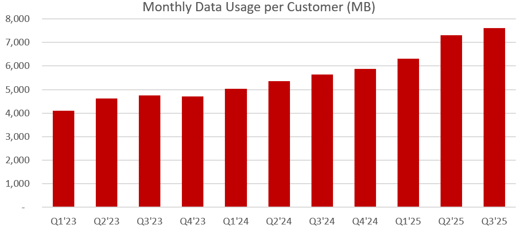 But then Q3 earnings came out. To my eye, they were normal in pretty much every way. Subscriber count, data usage per user, constant currency revenue growth, EBITDA margin — all in line with the recent average/trend: